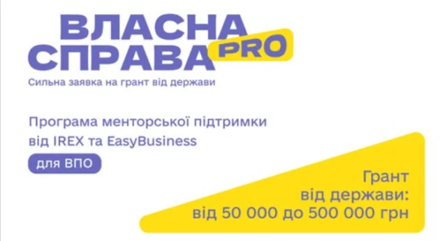 IREX та ГО EasyBusiness надають можливість взяти участь у програмі індивідуальної менторської підтримки «Власна справа PRO» для ВПО, які мають бізнес-ідею або вже розвивають мікро- чи малий бізнес та планують податися на державну грантову програму «Власна справа». Учасники отримають від 2 до 4 годин персональних консультацій із досвідченими менторами, що допоможе трансформувати загальну ідею у структурований проєкт та якісно підготувати бізнес-план за офіційним шаблоном держави. Метою ініціативи є подолання головного бар’єра при поданні на гранти - помилок у розрахунках та невідповідності заявки вимогам програми «єРобота». Кінцевою ціллю є підвищення шансів ВПО на отримання безповоротного фінансування до 500 000 грн для створення нових робочих місць, закупівлі обладнання чи масштабування власної справи в будь-якому регіоні України.