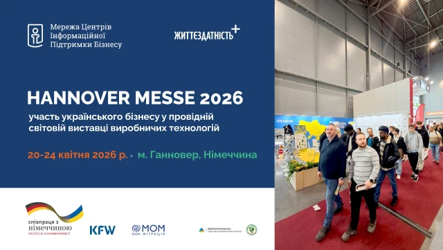 Міжнародна організація з міграції в Україні та Мережа Центрів інформаційної підтримки бізнесу надають можливість МСП з Київської, Чернігівської та Сумської областей взяти участь у колективному стенді на найбільшій у світі промисловій виставці HANNOVER MESSE 2026, що відбудеться з 20 по 24 квітня 2026 року в Ганновері, Німеччина. Учасники отримають організаційну підтримку, B2B-зустрічі, компенсацію проживання та логістики в межах вартості проєкту, а також можливість презентувати інноваційні рішення в галузях машинобудування, автоматизації, цифровізації та енергетичного переходу, налагодити міжнародні партнерства та вийти на нові ринки.