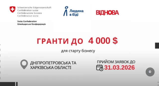 Чеська гуманітарна організація «Людина в біді» за фінансової підтримки Швейцарії надають можливість отримати грант у розмірі до $4 000 на запуск або відновлення власної справи для фізичних осіб з обмеженими економічними можливостями, які проживають у Дніпропетровській та Харківській областях. Метою проєкту є підтримка вразливих верств населення, які втратили бізнес чи роботу через війну, шляхом надання фінансової допомоги, безкоштовного навчання та менторського супроводу для офіційної реєстрації та розвитку підприємницької діяльності. Ціль ініціативи полягає у стимулюванні самозайнятості та покращенні економічного добробуту місцевих громад через створення нових мікропідприємств.