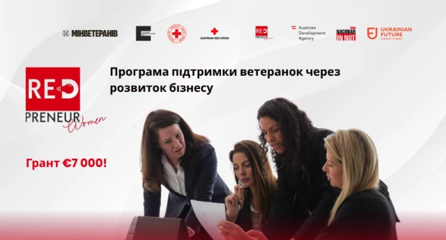 Український Червоний Хрест, Австрійський Червоний Хрест за підтримки фонду Neighbour in Need та Austrian Development Agency - надають можливість взяти участь у програмі REDpreneur Women, що передбачає тримісячне онлайн-навчання, менторську підтримку та грант у розмірі €7 000 для розвитку або запуску власної справи. Програма спрямована на підтримку ветеранок, які прагнуть розвинути бізнес або започаткувати соціальні інновації, забезпечити доступ до сучасної бізнес-освіти, посилити економічну незалежність жінок, які постраждали від війни, та сприяти створенню нових робочих місць через реалізацію життєздатних бізнес-планів.