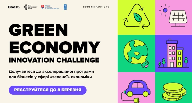 ПРООН в Україні та BOOST у межах проєкту Фонд міських експериментів (CEF) за фінансової підтримки Уряду Словацької Республіки надають можливість взяти участь у акселераційній програмі CEF x BOOST Green Economy Innovation Challenge для ММСП із Ніжина та Ковеля. Учасники отримають доступ до навчальних сесій для посилення бізнес-моделей, індивідуальний експертний супровід для доопрацювання інновацій, менторську підтримку в оцінюванні впливу на Цілі сталого розвитку та можливість презентувати свої рішення на Demo Day. За результатами програми чотири підприємства (по два з кожного міста) отримають грант у розмірі $10 000 на пілотування та впровадження власних «зелених» рішень на місцевому рівні.