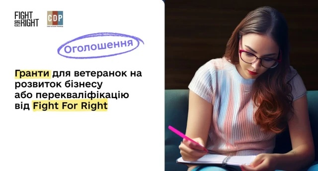 Fight For Right у межах проєкту «Розширення можливостей ветеранок з інвалідністю» за підтримки Center for Disaster Philanthropy надають можливість отримати грант у розмірі до $3 000 на розвиток власної справи або перекваліфікацію для ветеранок з інвалідністю та без інвалідності. Мета конкурсу – підтримати жінок, які повертаються до цивільного життя після служби, допомогти їм у реінтеграції, здобутті нової професії, самозайнятості та залученні до суспільного життя. Учасниці отримають не лише фінансову підтримку, а й індивідуальне менторство, а також можливість брати участь в офлайн-активностях, зокрема у дводенному адвокаційному візиті до Києва для зустрічей із представниками парламенту та урядових структур.